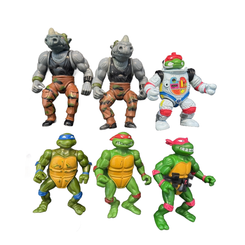 Includes 10 loose Teenage Mutant Ninja Turtles action figures featuring various characters like Leonardo, Donatello, Raphael, Rocksteady, and more. Perfect for display or play. Minor wear due to age, sold as-is. No accessories included.