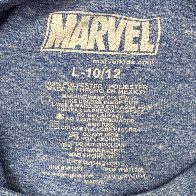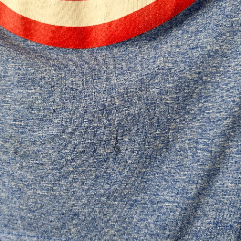 This vintage youth t-shirt features the iconic Captain America shield on a soft heather blue fabric. Lightweight and worn-in, it offers a nostalgic superhero look for young fans. Ideal for casual wear or collecting.