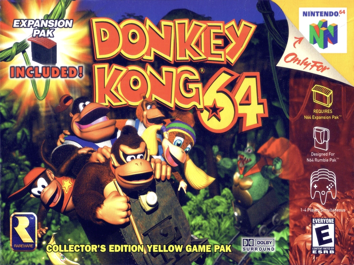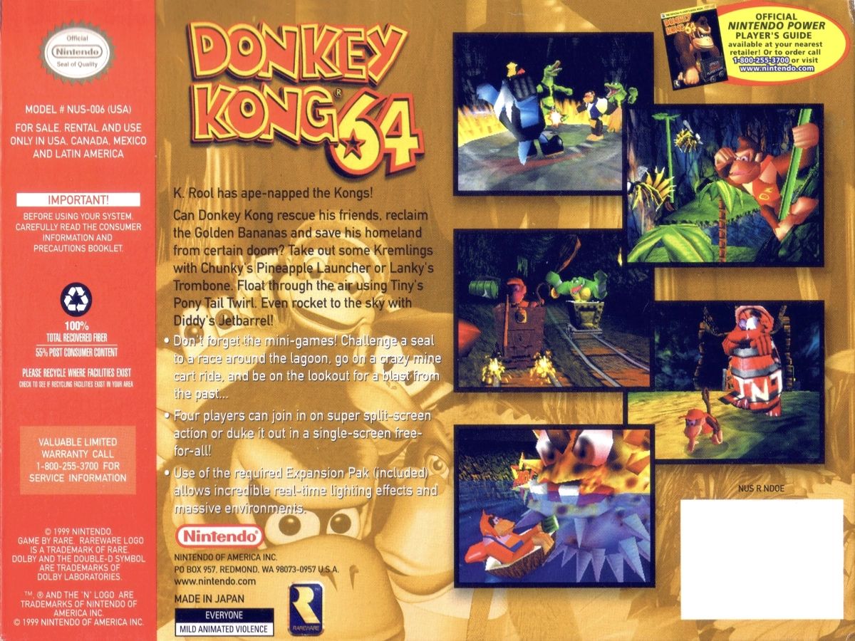 K. Rool has kidnapped the Kongs! Can Donkey Kong rescue his friends, reclaim the Golden Bananas and save his homeland from certain doom? Take out some Kremlings with Chunky's Pineapple Launcher or Lanky's Trombone. Float through the air using Tiny's Ponytail Twirl. Even rocket to the sky with Diddy's Jetbarrel!
