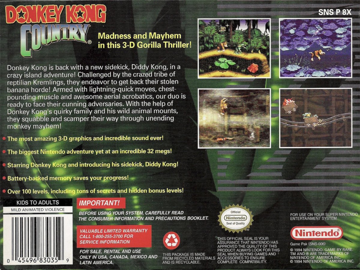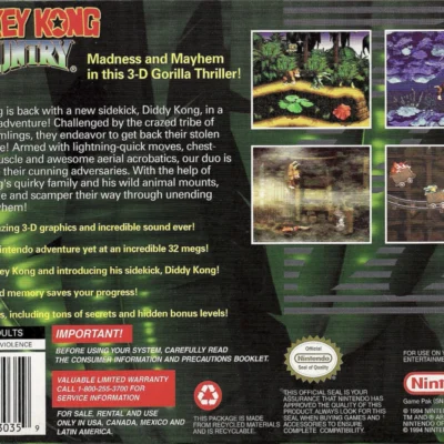 Donkey Kong is back in Nintendo's Donkey Kong Country, with a new sidekick, Diddy Kong, in a crazy island adventure. Challenged by the crazed tribe of reptilian Kremlings, they endeavor to get back their stolen banana horde! Armed with lightning-quick moves, chest-pounding muscle and awesome aerial acrobatics, our duo is ready to face their cunning adversaries. With the help of Donkey Kong's quirky family and his wild animal mounts, they squabble and scamper their way through the unending monkey mayhem.
