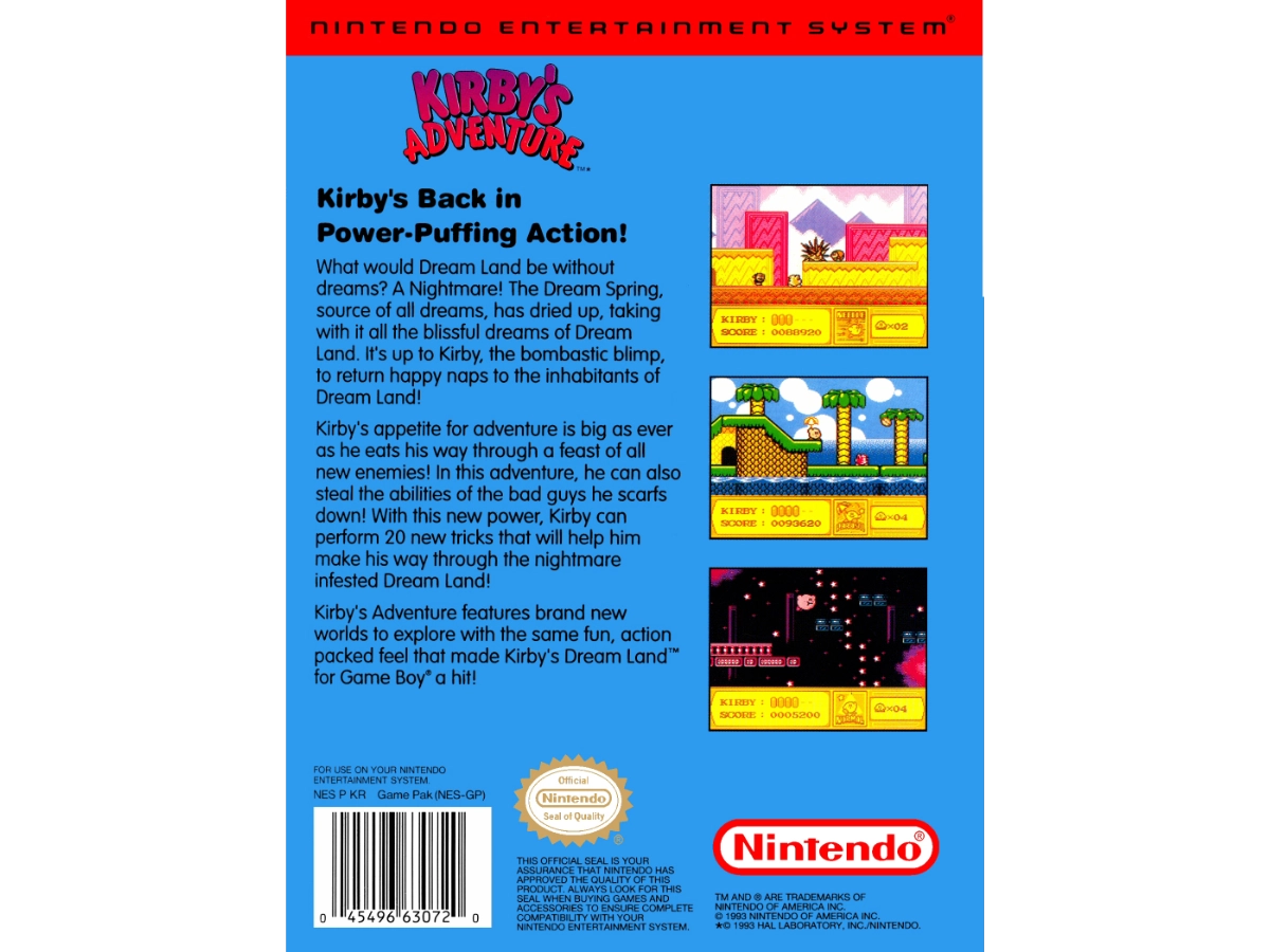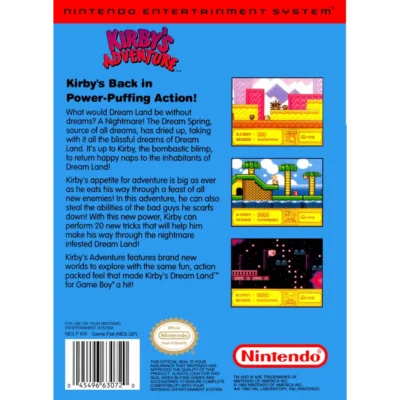 What would Dream Land be without dreams? A nightmare! The Dream Spring, source of all dreams, has dried up, taking with it all the blissful dreams of Dream Land. It's up to Kirby, the bombastic blimp, To return happy naps to the inhabitants of Dream Land! Kirby's appetite for adventure is as big as ever as he eats his way through a feast of all-new enemies! In this adventure, he can also steal the abilities of the bad guys he scarfs down! With this new power, Kirby can perform 20 new tricks that will help him make his way through the nightmare infested Dream Land! Kirby's Adventure features brand new worlds to explore with the same fun action-packed feel that made Kirby's Dream Land for Gameboy a hit!