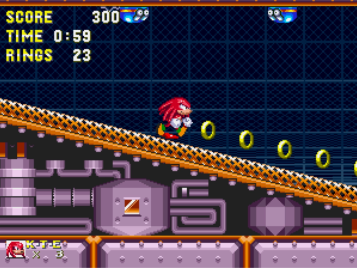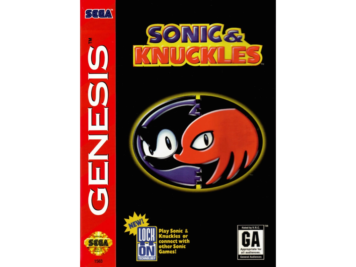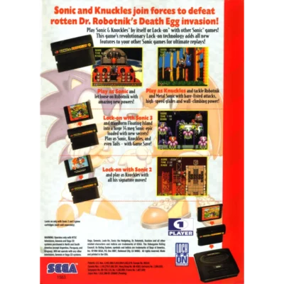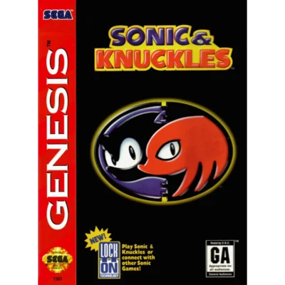 Sonic and Knuckles join forces to defeat rotten Dr. Robotnik's Death Egg invasion! Play Sonic & Knuckles by itself or Lock-on with other Sonic games. This game's revolutionary Lock-on technology adds all new features to your other Sonic games for ultimate replays! Play as Sonic and let loose on Robotnik with amazing new powers. Play as Knuckles and tackle Robotnik and Metal Sonic with bare-fisted attacks, high-speed glides and wall-climbing power! Lock-on with Sonic 3 and transform Floating Island into a huge 34 meg Sonic-epic loaded with new secrets! Play as Sonic, Knuckles, and even Tails - with Game Save! Lock-on with Sonic 2 and play as Knuckles with all his signature moves!