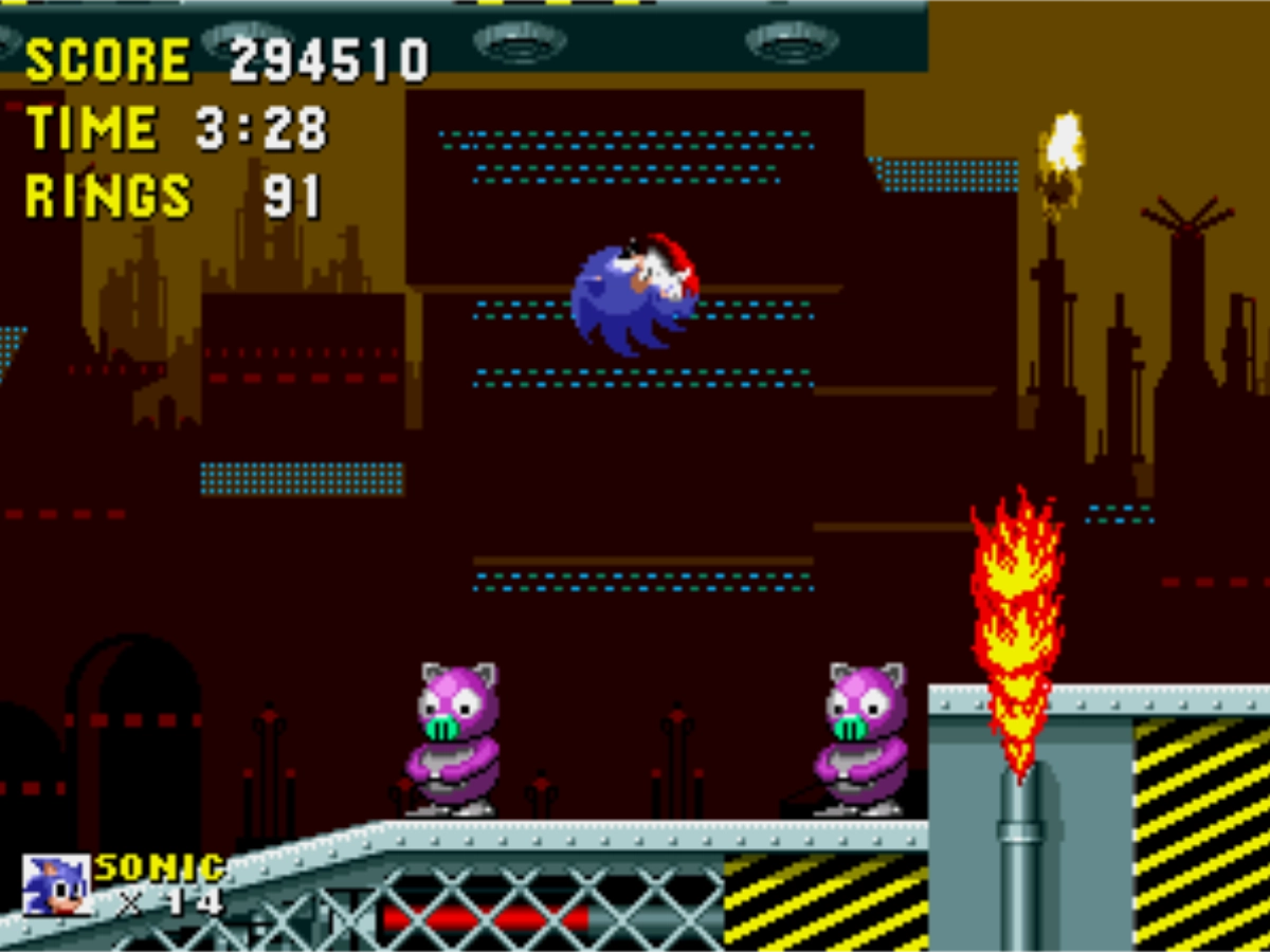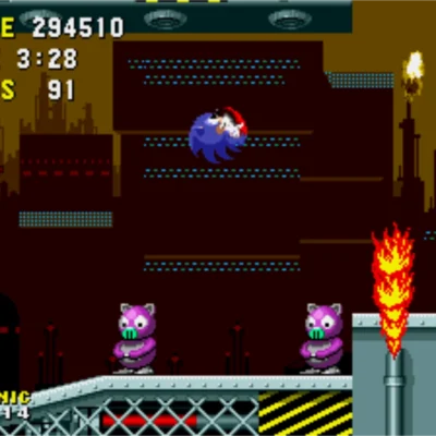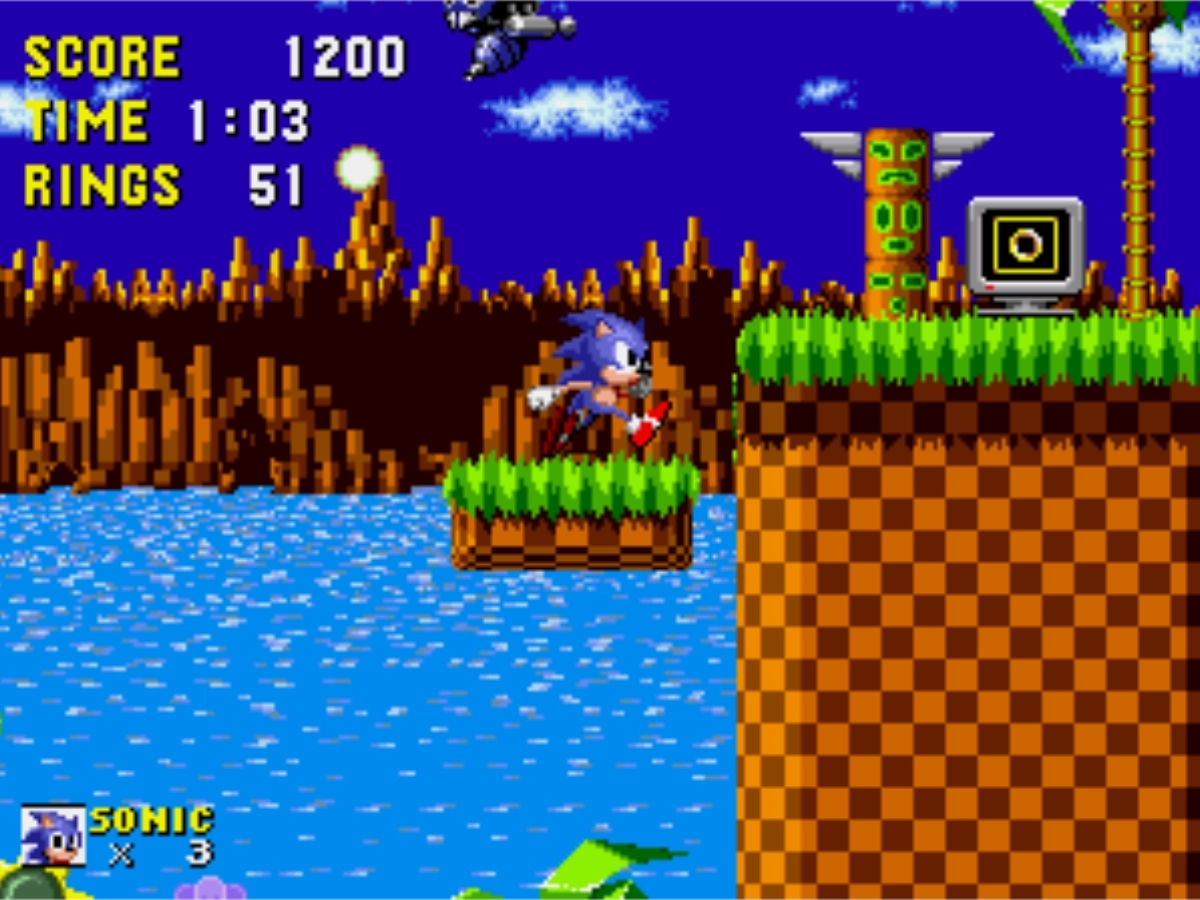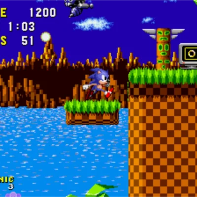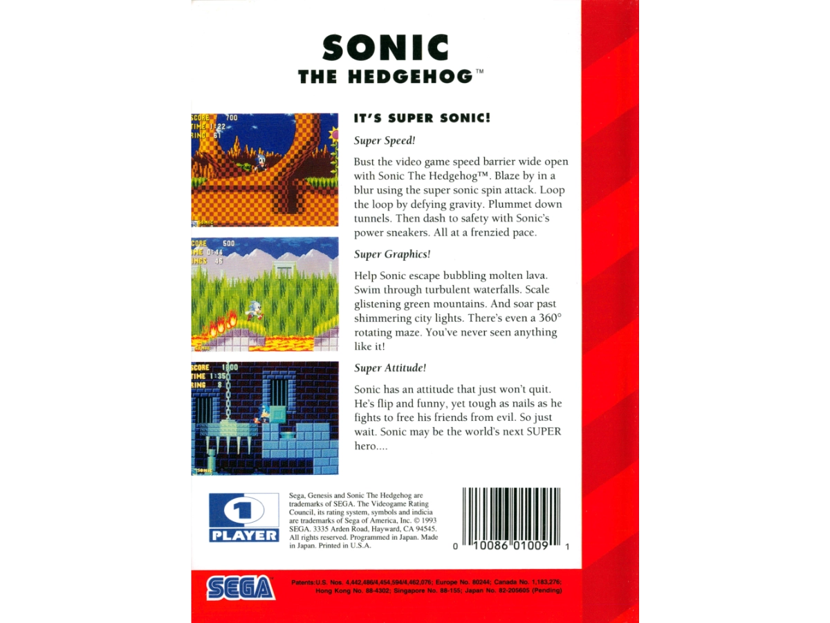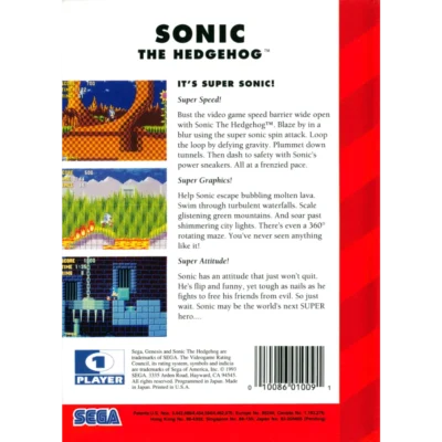Super Speed! Bust the video game speed barrier wide open with Sonic the Hedgehog. Blaze by in a blur using the super sonic spin attack. Loop the loop by defying gravity. Plummet down tunnels. Then dash to safety with Sonic's power sneakers. All at a frenzied pace. Super Graphics! Help Sonic escape bubbling molten lava. Swim through turbulent waterfalls. Scale glistening green mountains. And soar past shimmering city lights. There's even a 360 degree rotating maze. You've never seen anything like it. Supper Attitude! Sonic has an attitude that just won't quit. He's flip and funny, yet tough as nails as he fights to free his friends from evil. So just wait. Sonic may be the world's next superhero...