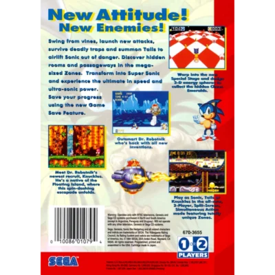 New Attitude! New Enemies! Swing from vines, launch new attacks, survive deadly traps and summon Tails to airlift Sonic out of danger. Discover hidden rooms and passageways in the mega-sized Zones. Transform into Super Sonic and experience the ultimate in speed and ultra-sonic power. Save your progress using the new save game feature.