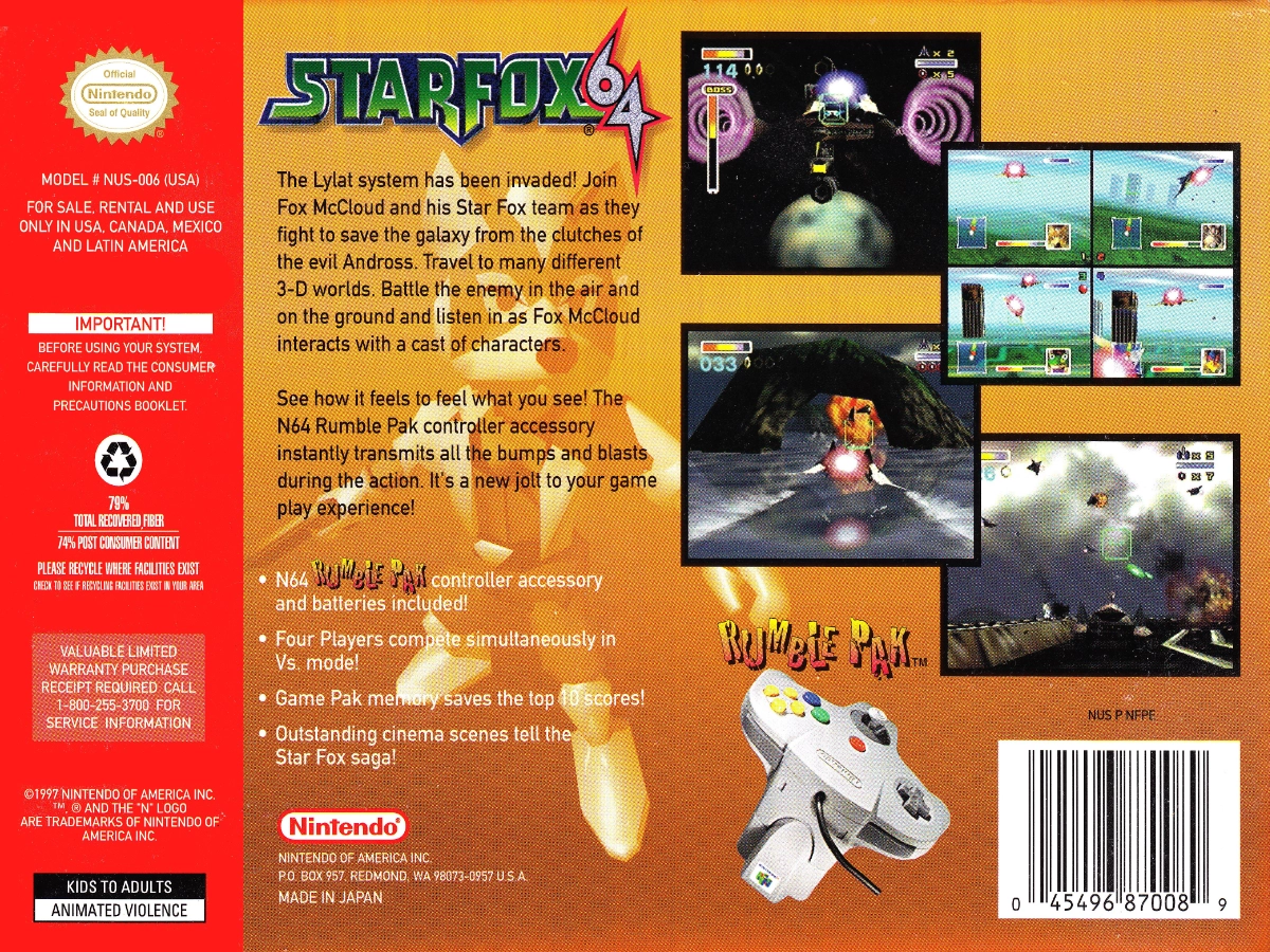 The Lylat system has been invaded! Join Fox McCloud and his Star Fox team as they fight to save the galaxy from the clutches of the evil Andross. Travel to many different 3-D worlds. Battle the enemy in the air and on the ground and listen in as Fox McCloud interacts with a cast of characters.