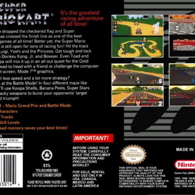 • The Super Mario GoKart Park is open for tons of racing fun! Hit the track with Mario, Luigi, Yoshi and the Princess. Get tough and lock fenders with Donkey Kong, Jr. and Bowser. Even Toad and Koopa Troopa will mix it up in an all-out quest for the Gold Cup! Race head-to-head with a friend or challenge the computer in great, split-screen, Mode 7 graphics.