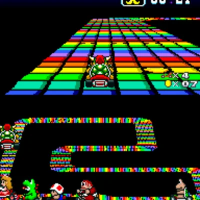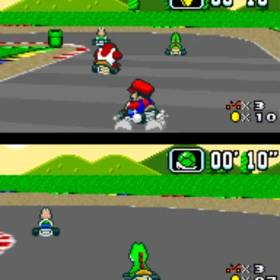Kart racing game in which the player takes control of either Mario, Luigi, Princess Toadstool, Toad, Yoshi, King Bowser, Donkey Kong Jr. or Koopa Troopa. Players can race in four cups, take time trials or battle against each other.