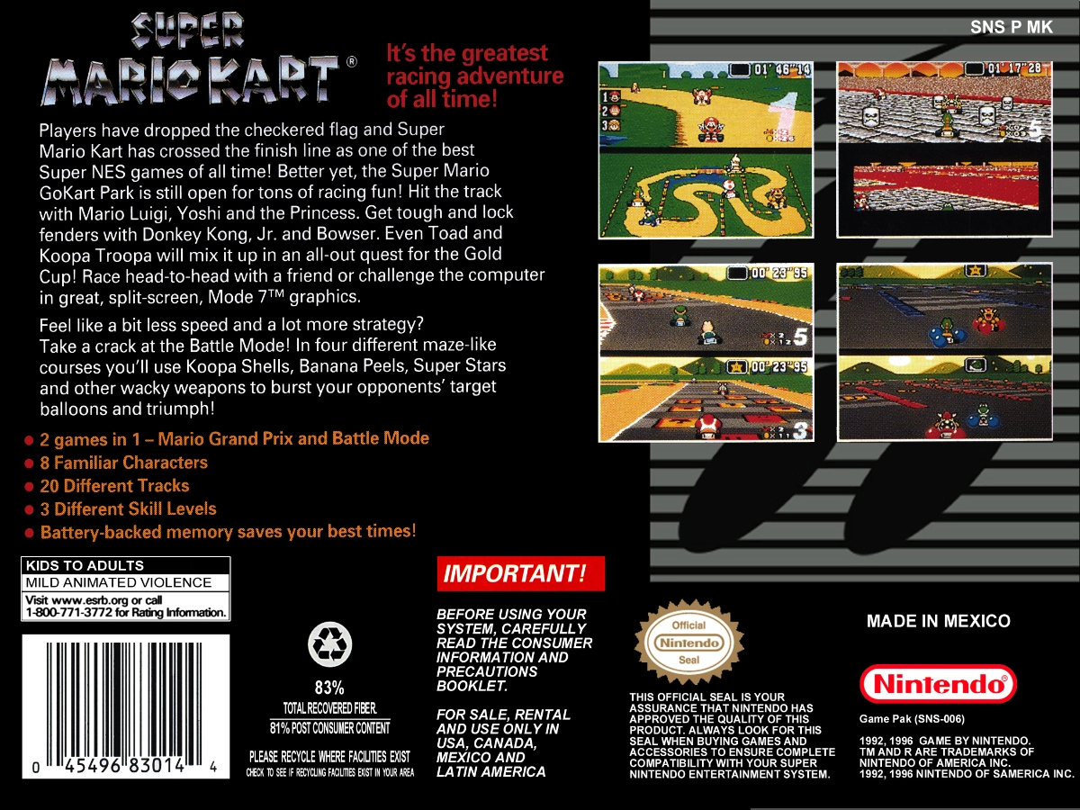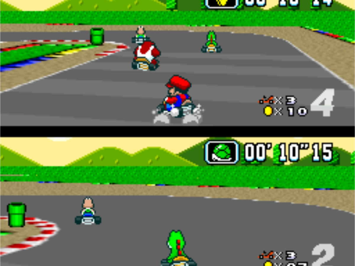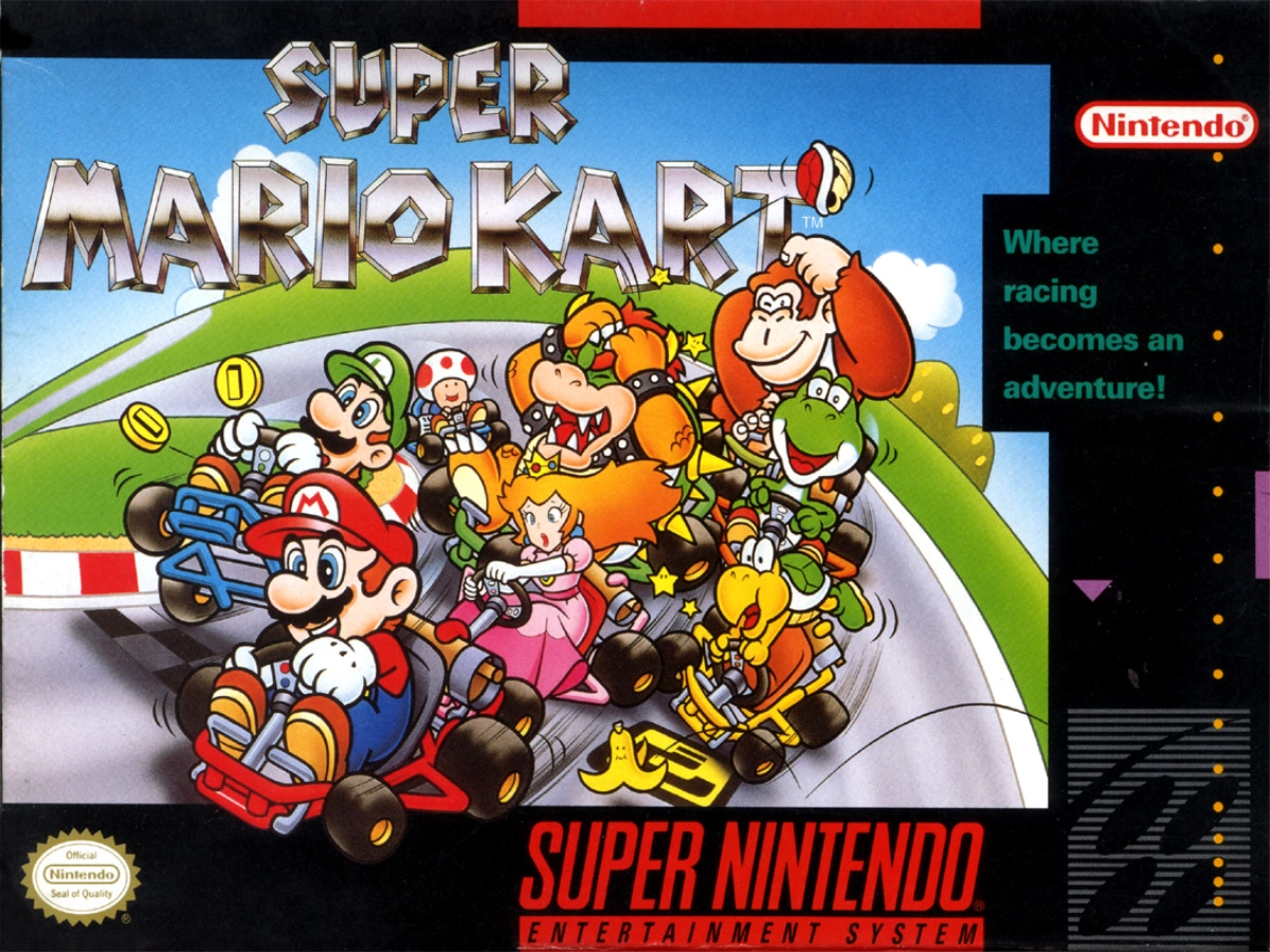 • The Super Mario GoKart Park is open for tons of racing fun! Hit the track with Mario, Luigi, Yoshi and the Princess. Get tough and lock fenders with Donkey Kong, Jr. and Bowser. Even Toad and Koopa Troopa will mix it up in an all-out quest for the Gold Cup! Race head-to-head with a friend or challenge the computer in great, split-screen, Mode 7 graphics.
