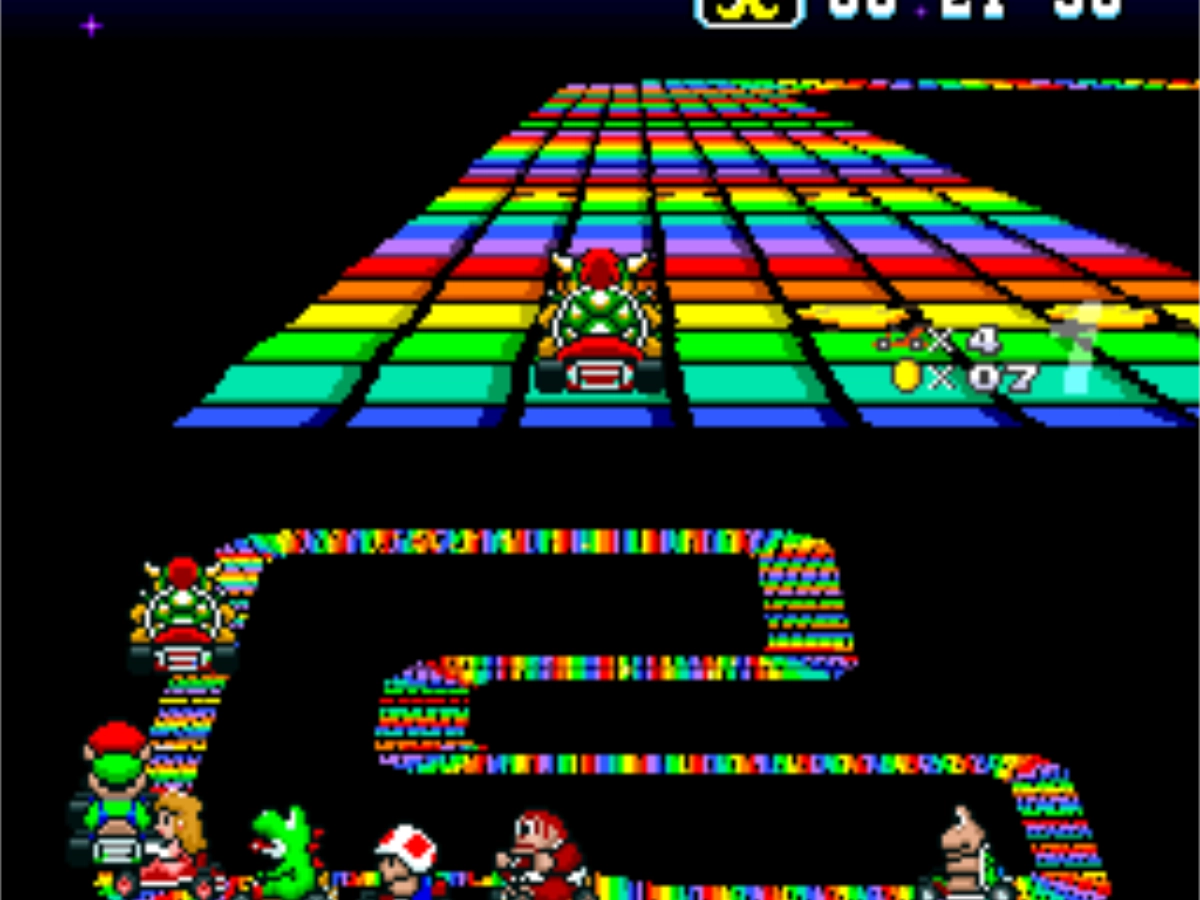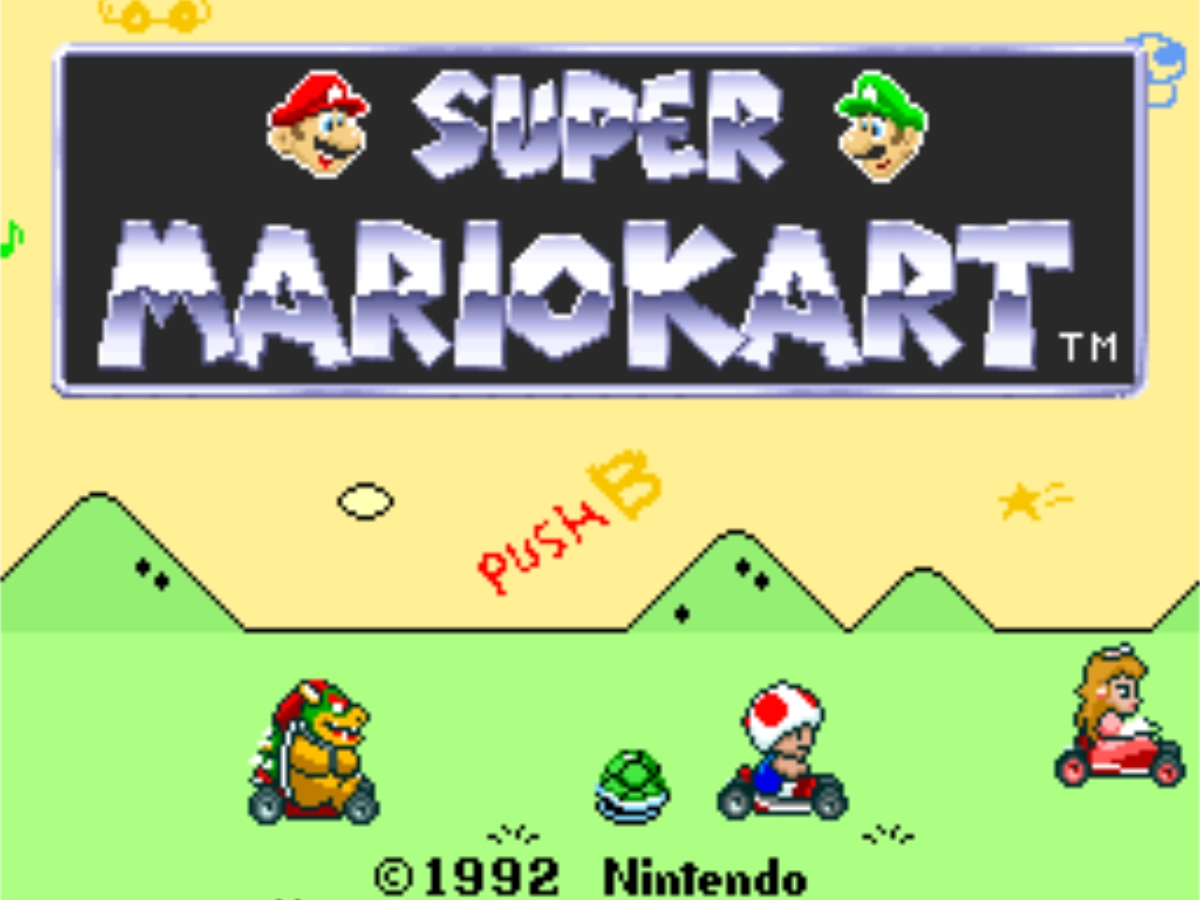 Kart racing game in which the player takes control of either Mario, Luigi, Princess Toadstool, Toad, Yoshi, King Bowser, Donkey Kong Jr. or Koopa Troopa. Players can race in four cups, take time trials or battle against each other.