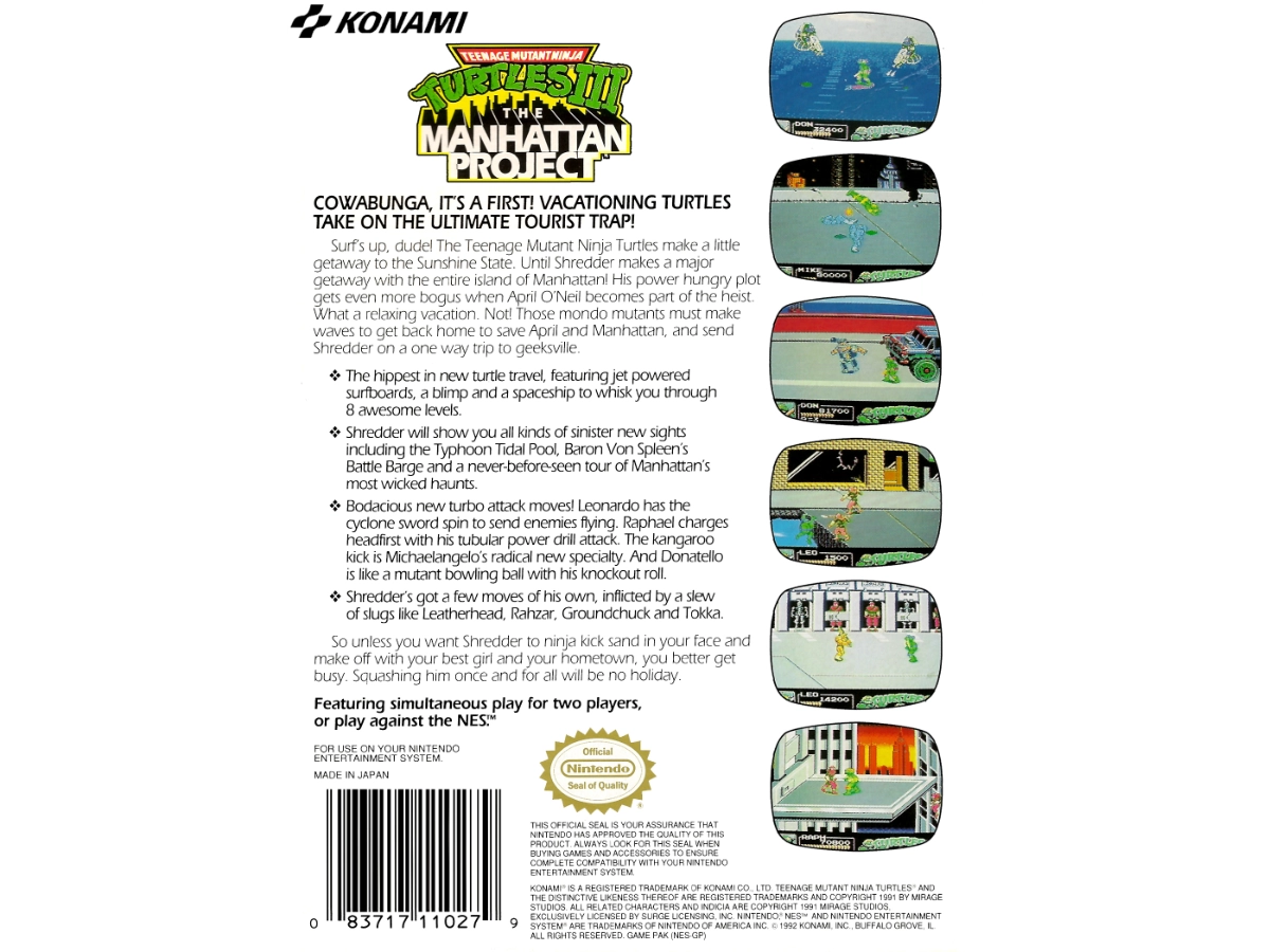 Not! Those mondo mutants must make waves to get back home to save April and Manhattan, and send Shredder on a one way trip to geeksville! So unless you want Shredder to ninja-kick sand in your face and make off with your best girl and your hometown, you better get busy. Squashing him once and for all will be no holiday.