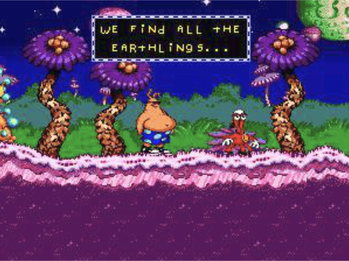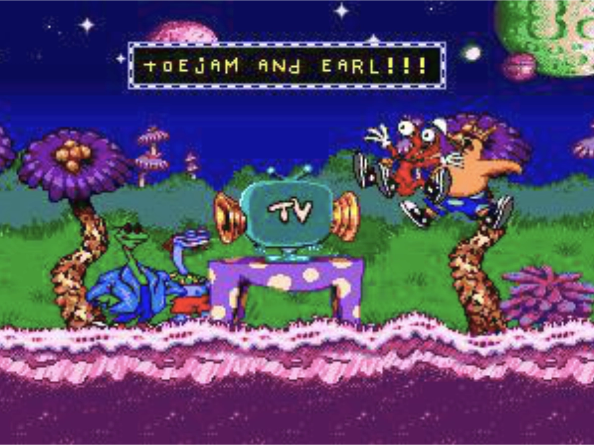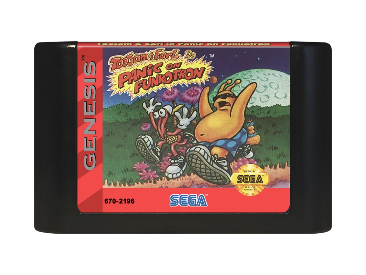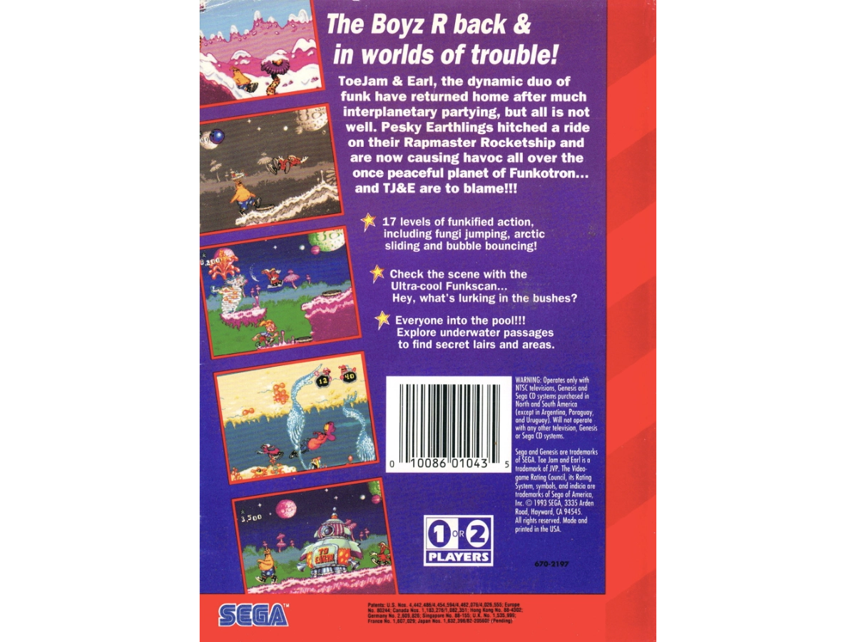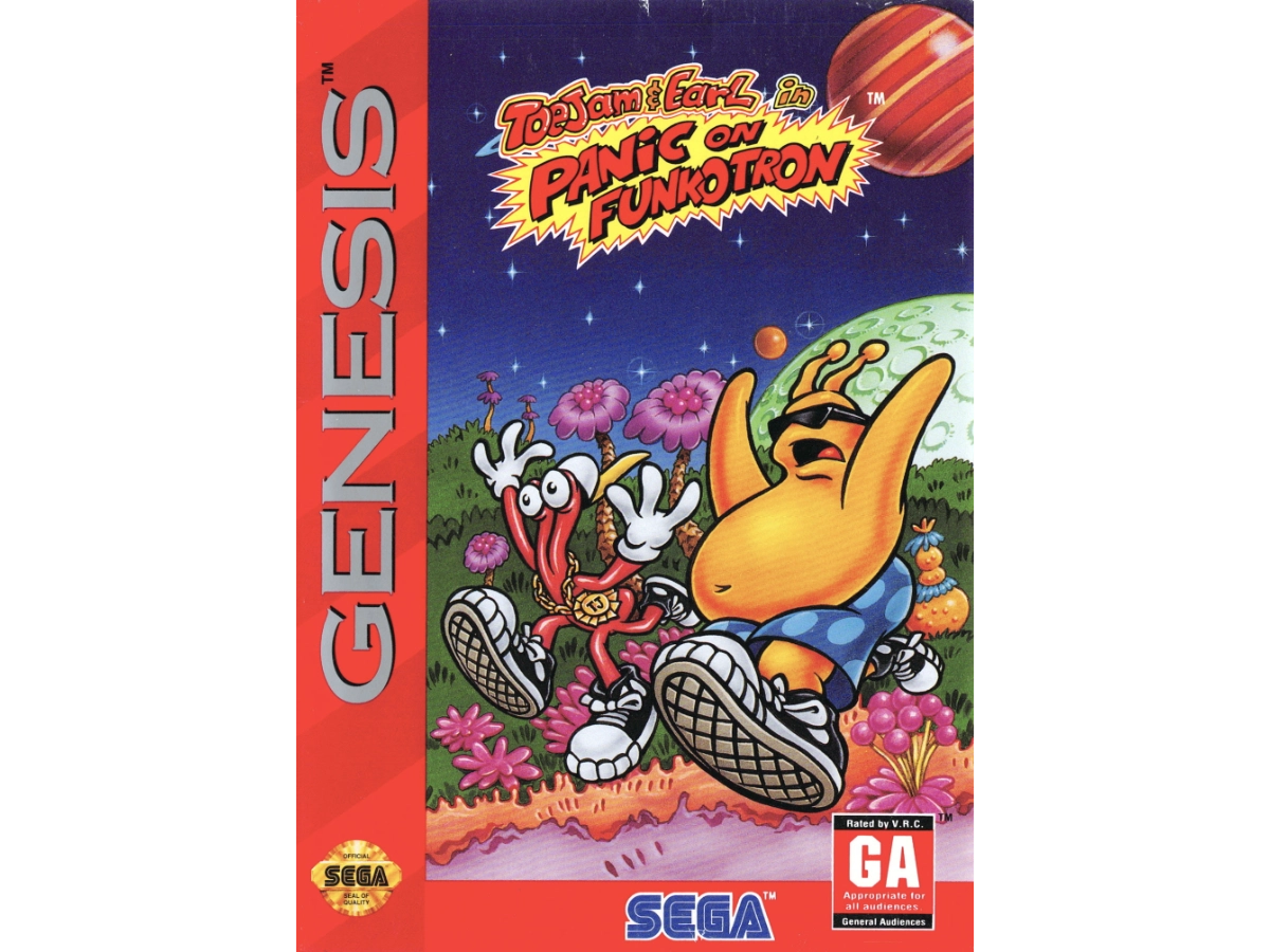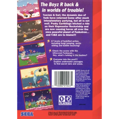 ToeJam & Earl, the dynamic duo of funk, have returned home after much interplanetary partying, but all is not well. Pesky Earthlings hitched a ride on their Rapmaster Rocketship and are now causing havoc all over the once peaceful planet of Funkotron... and TJ&E are to blame!!! 17 levels of funkified action, including fungi jumping, arctic sliding and bubble bouncing. Check the scene with the Ultra-cool Funkscan... Hey, what's lurking in the bushes? Everyone into the pool!!! Explore underwater passages to find secret lairs and areas.